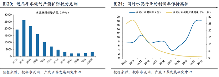 水泥:自2016年以来,国家政策指导供给侧改革,水泥行业的过剩产能大幅置换出清,供需结构明显改善。截止到2019年底,全国水泥行业CR10达到57%,对于区域性极强的水泥行业而言已经形成较为稳定的供给格局。京津冀地区的水泥CR3达到60%以上、长三角地区更是达到70%+。格局清晰的供给格局使得优质公司可以在需求总量平稳的基础持续改善盈利水平、释放业绩,近几年水泥行业的利润率持续改善,从2015年的3.71%逐步上行至2019年的18.49%。当前伴随着国内生产端回暖,政策“两重一新”也将增加新/老基建也将迎来修复,供给格局良好的水泥在需求回暖之际也将迎来相对更优的业绩修复弹性。