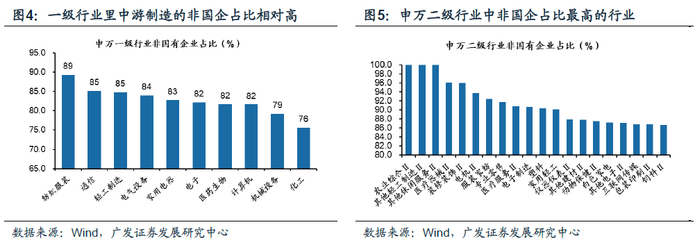 民企占比高的行业产业格局调整相对灵活,供给出清更为市场化,而国企占比高的行业市场化供给出清则相对缓慢。从上市公司国企与非国企的占比情况来看,周期上游、金融地产、军工、公用事业、以及一般零售的国企占比较高,而纺服、家用轻工、家电等可选消费、以及机械设备、电子、计算机等高端制造的国企占比较低,供给端结构调整将更为市场化。