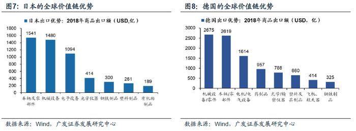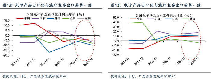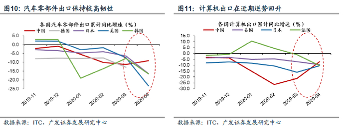 2.2 全球市场:重要供给方生产受约束形成的供给替代对于全球市场而言,重要生产国前期遭遇明显供给约束、而我国形成一定供给替代能力的行业,在生产率先恢复后有望抢占更大的市场份额。但阶段性的替代是否在海外生产完全恢复以后依然可持续仍有待观察。我们可以通过近几个月的出口细分数据来观察各行业的外需变化情况。其中防疫用品与ICT产品因为疫情所带来的场景消费品需求(口罩、医疗设备、平板电脑等)而展现了较强的出口韧性。但除需求端的原因外,一部分也来自于产能转移所带来的韧性。首先,前期受疫情影响产生较为明显供给约束的国家集中于发达经济体,主要生产国为日韩和欧洲,拆分其具有全球市场出口份额明显优势的行业,观察近几个月在该领域我国与其他出口优势国的出口增速,可以大概探知是否已经形成了一定的供给替代。疫情国在全球出口份额中占据领先地位的行业包括:计算机电子光学产品(韩国,日本),光学及检验医疗设备(德国、日本),化学制品(韩国、日本),车辆及零部件(德国、日本)等。例如韩国是集成电路的出口大国,三星、SK海力士等电子名企技术与规模优势巨大;而日本与德国在光学仪器、医疗设备、汽车及零部件领域占据领先优势。中国在上述领域的出口份额相对靠后,且以中低端产品线路为主形成差异化竞争。而从国内的生产技术、研发投入、出口竞争力的边际变化来看,国产商品有望借此契机加速扩宽全球市场份额的行业包括:集成电路、面板、汽车零部件等领域。