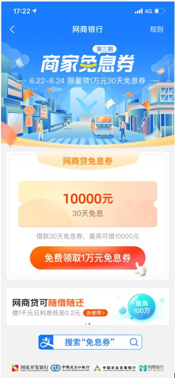 6月22日,三大政策行联合网商银行,再次发放贷款“免息券”,并且扩大规模,向全国100城的小店主们发放。小店主们可以直接上支付宝搜索“免息券”领取。每人可领取一张,每张代表1万元1个月免息。