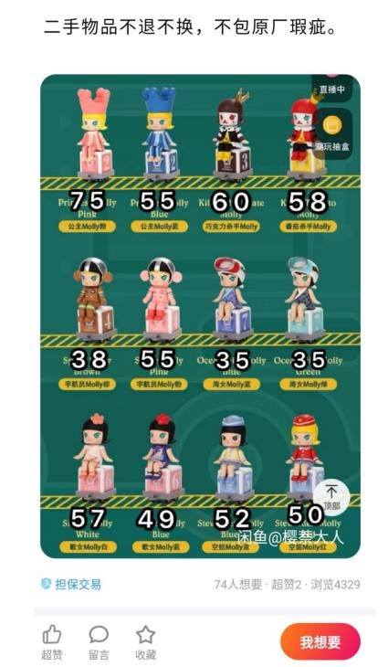 泡泡玛特线上社交业务的负责人认为,闲鱼等二手平台上,隐藏款的炒作现象其实被过度放大了。“整体来看,二手市场绝大多数交易的价格都在市场价附近波动,在30-80元不等。还有一个有意思的现象是,出售方会给每一款娃娃都标上不同的价格,比如同一款Molly小火车系列的娃娃,在闲鱼平台的售价有40、60、70元不等,这说明,玩家会完全按照个人喜好给不同的娃娃定价。整体来看,泡泡玛特的二手市场是比较健康的。”