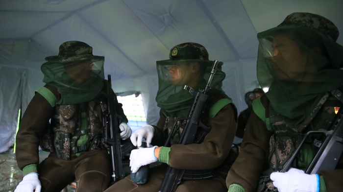 官兵们互相检查防蚊服的密封情况,在容易裸露的位置逐一喷涂驱蚊药。
