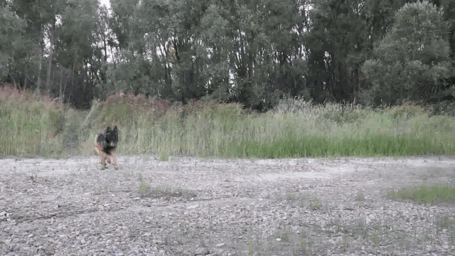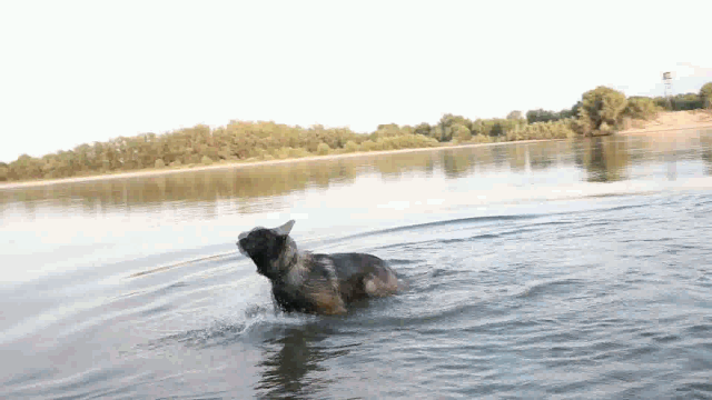 军犬炎龙忍受不了蚊虫叮咬,突然跑进额尔齐斯河中,在河中将身上打湿,再也不愿上来。