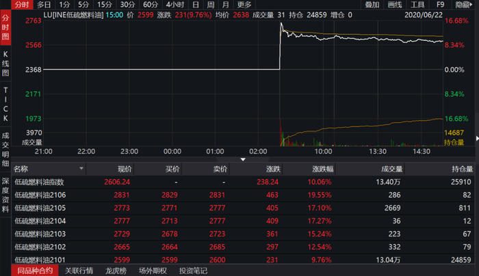中国证券报记者从上海期货交易所获悉,6月22日收盘,低硫燃料油期货总成交量13.40万手(单边,下同),成交金额35.41亿元,总持仓量2.59万手,其中主力LU2101合计成交量13.04万手,成交金额34.41亿元。主力LU2101合约收盘价2599元/吨,较挂牌基准价上涨9.76%。