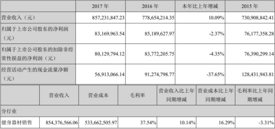 上市当年,英派斯增收不增利,净利出现下滑。2017年,英派斯实现营业收入8.57亿元,同比增长10.09%;归属于上市公司股东的净利润8317.00万元,同比减少2.37%;归属于上市公司股东的扣除非经常性损益的净利润8012.98万元,同比减少4.35%;经营活动产生的现金流量净额5691.31万元,同比减少37.65%;主营业务毛利率37.54%,比上年同期减少3.31个百分点。