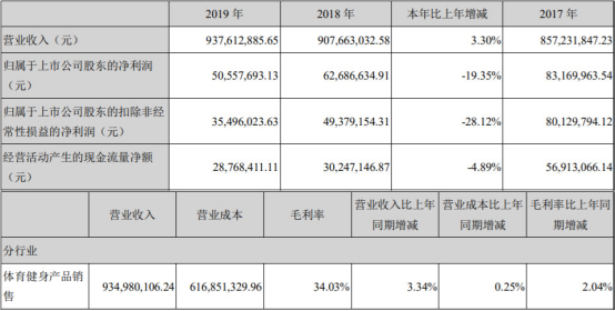 上市第三年,英派斯净利继续下滑。2019年,英派斯实现营业收入9.38亿元,同比增长3.30%;归属于上市公司股东的净利润5055.77万元,同比减少19.35%;归属于上市公司股东的扣除非经常性损益的净利润3549.60万元,同比减少28.12%;经营活动产生的现金流量净额2876.84万元,同比减少4.89%;主营业务毛利率34.03%,比上年同期增长2.04个百分点。