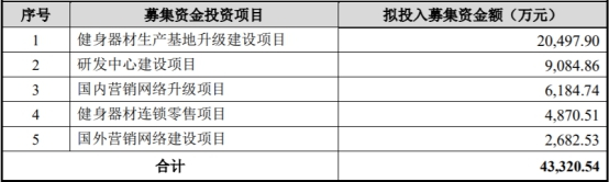 英派斯上市时披露的公告书显示,公司上市发行股份数量为3000万股,募集资金总额为4.82亿元,扣除发行费用后募集资金净额为4.33亿元,分别用于健身器材生产基地升级建设项目、研发中心建设项目、国内营销网络升级项目、健身器材连锁零售项目、国外营销网络建设项目。