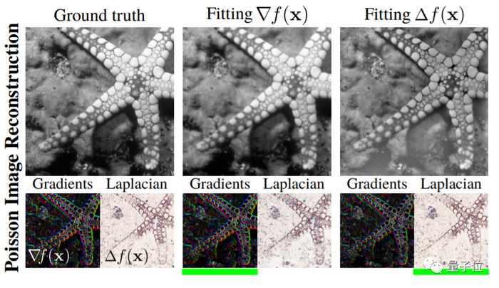 下图是SIREN对海星图像采用梯度或Laplacians(绿色下划线表示采用的监督方式)进行监督学习的效果。