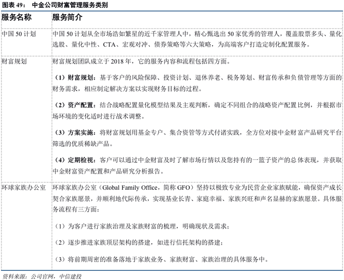 (2)在服务方面,中金公司相继推出中国50计划、财富规划、环球家族办公室等创新性服务安排,这些服务安排与摩根士丹利的私人财富管理服务、国际财富管理服务相似,都是围绕特定客户群体的财富管理需求提供个性化的服务,利于长期巩固高净值客户的粘性。