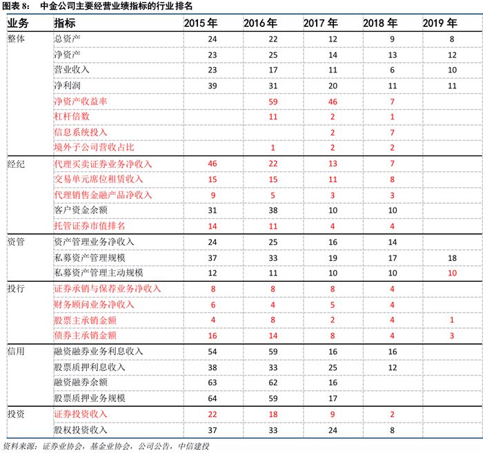 通过多元化战略布局和综合能力建设,中金公司各项排名回升至行业前列。整体来看,2019年度中金公司营业收入、净利润分别排名行业第10和第11,年末总资产和归母股东权益分别排名行业第8和第12,境外子公司营收占比位居行业前2。分项目来看,中金公司在代销金融产品业务、股债承销业务、证券投资业务等方面跻身行业前5。