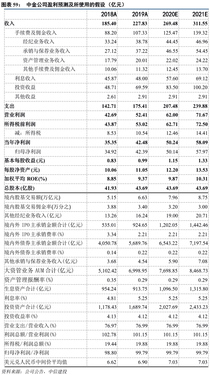 我们预测中金公司2020-2021年EPS分别为1.15/1.33元,分别同比增长15.92%/15.61%,BVPS为12.20/13.53元,分别较年初增长10.38%/10.87%,ROE分别为9.87%/10.31%。预测所使用的假设如下表所示。