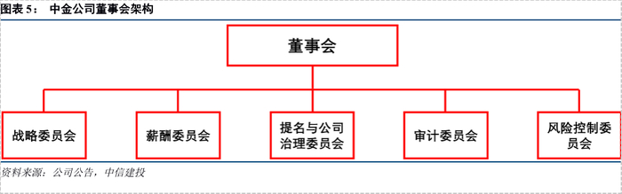 中金公司同样只设一位执行董事,但董事长和CEO不兼任,董事会的监督能力更强。创立伊始,中金公司仅保留董事长委任权,把CEO委任权交给摩根士丹利,以换取投资银行技术的转让,这使得董事长、CEO的职位一开始就是分开的。此后,摩根士丹利淡出高管层,中金公司董事长、CEO由两位中方人士分别担任,两项职能继续分立,确保了董事会的独立性。此外,2019年末,中金公司董事会共有10位成员,其中唯一的执行董事由CEO黄朝晖先生担任,5位非执行董事主要由中投保公司、汇金公司、海尔集团和新华保险等重要股东委任,重要股东可对中金公司实施有效的监督。