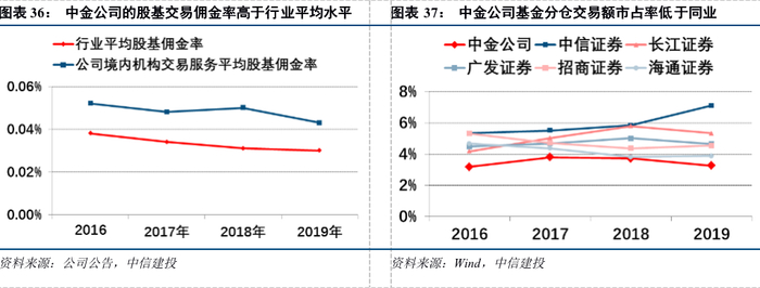 中金公司的机构交易服务定位高端化,维持较高佣金率,但未形成绝对优势。中金公司的境内机构客户数超过3600名,涵盖前五十大公募基金和多家银行理财子公司。在市场竞争激烈、费率下行的环境下,中金公司通过差异化/定制化的一站式服务、一流的销售/交易/研究服务以及跨境业务优势,使得费率略高于行业平均水平。但与此同时,中金公司的机构交易服务尚未形成绝对优势:从交易额来看,2019年中金公司的公募基金分仓交易额市占率为3.26%,排名国内同业第12;从交易收入来看,2018年中金公司的交易单元席位租赁业务收入排名行业第8。未来中金公司将加大力度推进股票业务综合服务平台建设工作,继续夯实机构化、产品化、国际化的战略布局,凭借境内外、场内外的综合业务布局和协同发展,实现业务模式升级和多元化增长。