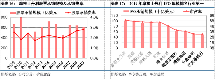 摩根士丹利以投行业务作为立足之本,是全球最大的股权承销商之一。过去十年中,全球股权承销市场竞争趋于激烈,摩根士丹利把握住了直接上市(DPO)诞生和再融资流动性改善的机会,股权承销规模随市场景气度震荡,承销费率持续上行。2019年度,摩根士丹利IPO承销规模达到100.1亿美元,市占率约5.14%,排名全球投行第一。