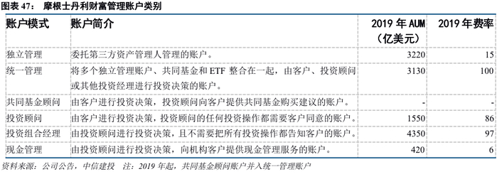 (1)在账户方面,摩根士丹利提供独立管理、统一管理、共同基金管理、财务顾问、投资组合经理、现金管理等账户,大多数客户可以根据自身的账户操作偏好、顾问咨询需求以及费率偏好,找到适合自身的账户类别。其中,独立管理账户以及统一管理账户的资产管理规模占比分别达到25.41%和24.70%,这两项账户引入了第三方管理人,可避免客户利益和摩根士丹利投资顾问的利益发生冲突,因而近年来维持了一定比重。