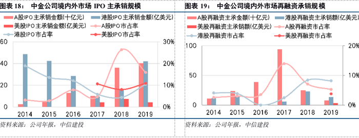 中金公司同样以投行业务作为立足之本和核心竞争力来源,境外业务特点鲜明。2019年度,中金公司参与的A股股权融资项目主承销金额601.46亿元,排名行业第1;其中,A股IPO项目主承销金额601.46亿元,排名国内同业第1。中金公司参与的香港股权融资项目承销金额50.40亿美元,排名国内同业第1;其中,香港IPO项目承销金额42.01亿美元,排名国内同业第1。中金公司参与的中国公司美国IPO项目承销金额4.09亿美元,排名国内同业第2。