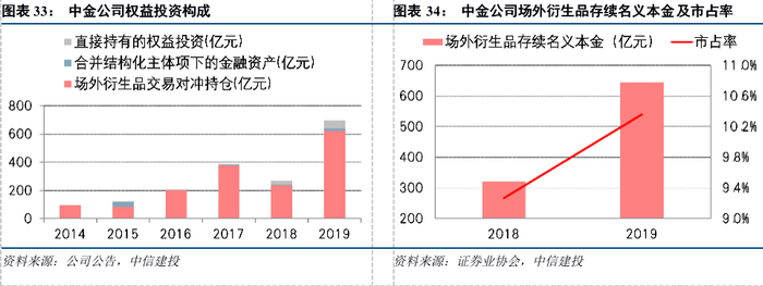 中金公司同样基本不做方向性自营,专注为客户提供衍生品交易服务。中金公司的权益投资,在资产负债表中计入“以公允价值变动计量且其变动计入当期损益的金融资产:权益投资”之中。2019年末,该会计科目的金额中,有89%是“场外衍生品交易对冲持仓”,有8%是“直接持有的权益投资”(主要为私募股权投资基金的权益投资、科创板跟投及新三板做市业务的股票投资),剩余3%是“合并结构化主体项下的金融资产”。由此可见,中金公司的权益投资并非传统意义上的方向性自营权益投资,而是为对冲衍生品业务市场风险而进行的投资,这些投资的公允价值变动风险主要由客户承担,对中金公司损益没有重大影响。