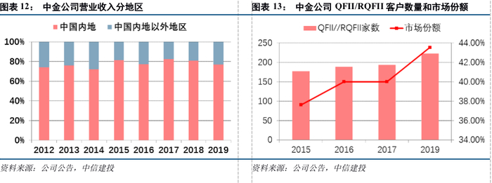 (3)中金公司是我国首批为QFII及RQFII提供服务的中资证券公司之一,在服务QFII及RQFII客户方面的所有中资证券公司中居于领先地位。截至2019年12月31日,中金公司为国内510家QFII及RQFII中的222家提供证券经纪服务,客户覆盖率达到43.53%。