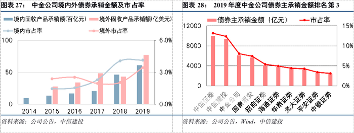 (2)资产配置方面,中金公司持续丰富牌照和服务类型,成为首批获得利率互换业务资格的券商、首批国债期货交易参与机构、首批信用风险缓释工具核心交易商、首批信用风险缓释凭证和信用联结票据创设机构、首批信用衍生品业务全牌照机构。值得一提的是,中金公司在承销债券产品和ABS产品的同时,可从中筛选收益良好、违约率低的产品进行跟投,后续既可以持有至到期赚取稳定利差,也可以用于财富管理客户的流动性做市,这种业务模式既能充分满足客户的融资需求,又能实现销售服务与固收产品承销业务的协同,还能提升收入的稳定性,可谓一举三得。