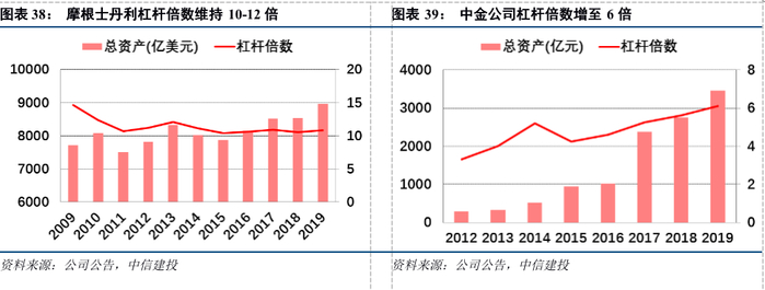 中金公司杠杆率虽然只有6倍,但已接近国内监管规则所允许的上限。我们以“(总资产-代经纪客户持有的现金)÷所有者权益”来计算中金公司杠杆率,那么2019年末中金公司杠杆率为6.11倍,低于摩根士丹利同期水平,但高于国内绝大多数券商的水平。我们在《如何提升券商的杠杆率?》报告中测算过,在《证券公司风险控制指标管理办法》的约束下,国内券商杠杆率最多不超过7倍,这意味着中金公司的杠杆率已接近国内监管规则所允许的上限。未来相关监管规则若有放宽,中金公司将是首要受益者,可以将更多的资本投入到固收投资交易业务的发展上。