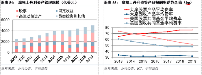 优秀的主动管理能力给摩根士丹利带来了良好声誉和产品溢价。近年来,美国大资管行业竞争愈发激烈,被动管理规模占总体资产管理规模的比重提升,导致全行业管理费率持续走低;摩根士丹利受益于强大的主动管理能力,整体管理费率保持稳定,股票型产品的管理费率甚至持续上行。2019年度,美国股票型共同基金的平均管理费率由去年同期的55bp降至52bp低位,而摩根士丹利的股票型产品的平均管理费维持76bp高位不变。
