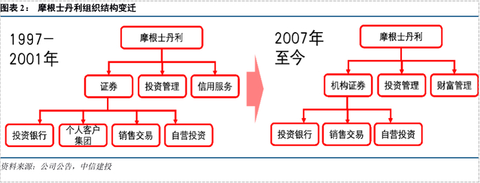 摩根士丹利的组织结构强调“以客户为中心”的理念。近年来,摩根士丹利的部门设置历经两次重大变化。2002年,摩根士丹利将证券部下的“个人投资者集团”升格并更名为财富管理部,原证券部更名为机构证券部。2007年,摩根士丹利将信用服务部剥离,保留“机构证券+财富管理+投资管理”的部门设置。在当前的组织结构中: