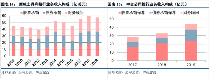 摩根士丹利投行业务主要为客户提供证券承销服务,以及并购重组、房地产与项目融资的财务顾问服务。2019年度,股票承销收入、债券承销收入、财务顾问收入分别占投行业务收入的30%、33%和27%,收入结构相对均衡。