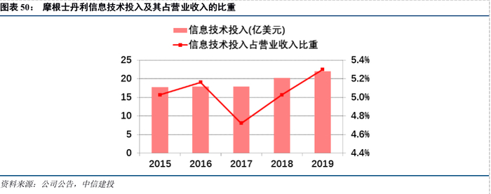 摩根士丹利注重金融科技的投入和运用,自建或外购金融科技平台。2018年6月,摩根士丹利CEO James Gorman表示,每年将40亿美元投入到金融科技的发展当中,相当于2017年除人工外费用预算的40%,对科技的重视程度可见一斑。摩根士丹利2019年薪酬计划将投资顾问使用公司新技术平台作为激励和考核项之一,明确加大推广使用Next Best Action、Goals Planning System等工具的力度,以积极姿态拥抱金融科技。