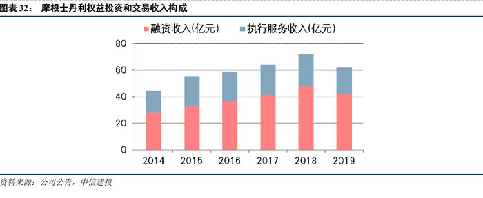 在此之后,摩根士丹利专注于融资业务(Financing)和执行服务业务(Execution Services),利用自有资金为客户投融资提供便利。其中,融资业务通过保证金借款、收益互换等工具,为活跃在权益市场的客户提供融资、主经纪商和基金管理等服务;执行服务业务为客户的股票、场内衍生品和场外产品交易提供执行和清算服务,包括为客户提供权益类证券、衍生品的做市服务。2019年度,融资收入和执行服务收入分别占权益销售投资和交易收入的68%和32%。