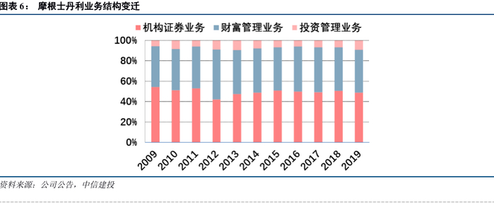 2008年金融危机后,摩根士丹利将财富管理部门作为新的战略重点。由于巨额亏损,以及“多德弗兰克法案”的强制要求,摩根士丹利于2012年剥离了旗下全部的自营交易部门。随后,摩根士丹利确定了“寻找新增长动能”、“提升ROE”、“提升股东现金回报”等三大目标,与三大目标最匹配的财富管理部门成为了战略侧重点。2008-2019年,财富管理部门的营业收入占比由28%提升至43%,机构证券部门的营业收入占比由67%降至49%,财富管理+机构证券成为摩根士丹利的盈利双引擎。