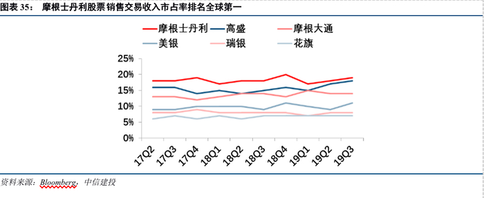 摩根士丹利积极沉淀科技实力,打造机构交易竞争优势,提升机构交易市场地位。(1)2010年,摩根士丹利推出全球投资组合级交易算法——MS PORT,该算法使用70多种不同的风险指标,判断资产之间的相关性、波动性及其预期市场影响,来优化投资组合执行效果、降低执行成本。(2)2012年,摩根士丹利升级了低延迟的交易系统Speedway,并启动Velocity项目,以满足量化投资者不断增加的高频交易需求。(3)2018年,摩根士丹利旗下的Luma公司推出针对结构性产品和年金的开放式线上平台,辅助机构客户进行交易头寸监控、教育培训和合规管理。依托金融科技沉淀,自2014年起,摩根士丹利的股权交易业务收入持续反超高盛,排名行业第一,2019年第三季度股权交易收入市占率达到18%。
