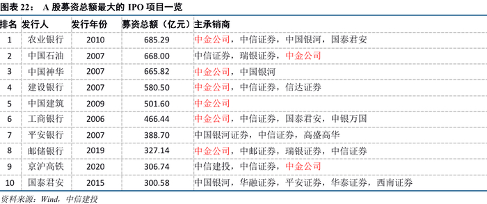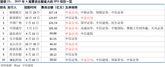 中金公司肩负起“为国有大中型企业的体制改革、战略重组和海外融资等提供多种服务”的政治使命,在大型国企的境内外股权承销方面占据绝对优势。2019年A股募集资金规模前十大IPO项目中,中金公司担任了8项的保荐机构及主承销商。A股历史上募集资金规模前十大IPO项目中,中金公司担任了8项的保荐机构及主承销商。募集资金规模前十大的中国公司境外IPO项目中,中金公司担任了8项的保荐人及/或联席全球协调人。