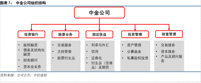 中金公司将“机构证券”进一步细分为“投资银行”、“股票业务”和“固定收益”,各类业务分部均有针对性的客户群体,符合“以客户为中心”的组织结构。各部门专门服务于特定的客户群体,可一站式满足客户全方位的投融资需求,又可避免多部门服务于同一客户带来的协调问题或者利益冲突问题。具体来看: