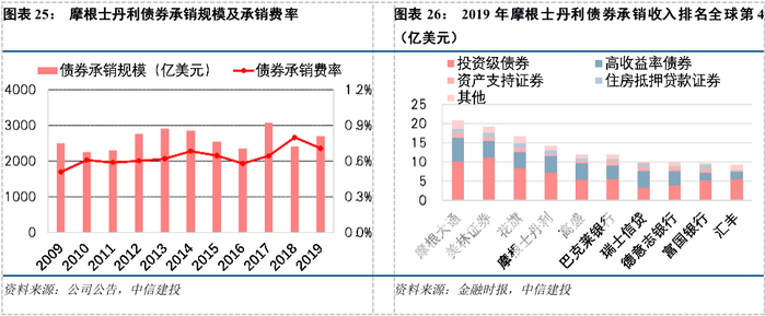 摩根士丹利债券承销规模和承销收入均跻身全球前十。摩根士丹利的债券承销金额随债市景气度起伏,2019年约2700亿美元;承销费率略低于竞争对手,近年来有所回升,2019年约为0.71%。
