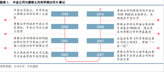 1995年7月,摩根士丹利联合中国建设银行、中国投资担保公司、新加坡政府直接投资公司等机构,共同出资设立了国内首家合资券商——中金有限,即中金公司的前身。根据双方签订的《经营技术转让合同》,摩根士丹利向向中金提供投资银行、直接投资、司库、外汇操作和其他技术与专门技术的转让与协助,并管理部分业务领域;中金公司借此建立了国内领先的业务体系,成为国内资本市场的领军券商之一,并获得了“国贸大摩”的诨号。