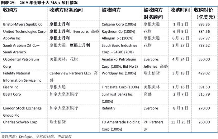 摩根士丹利擅长担任大型并购重组项目收购方的财务顾问。摩根士丹利通过严密的合规审查、丰富的跨境并购能力和强大的研究部门建立起品牌效应,让客户充分信任其并购重组业务实力;而高效的执行力、高度保密的经营习惯以及高管与客户高管的亲密私交,让摩根士丹利与客户的关系更加持久。2019年全球前四大并购重组项目的收购方,都聘请了摩根士丹利担任财务顾问,尤其是第一大和第三大项目的收购方,分别聘请摩根士丹利担任独家财务顾问;而大型并购重组项目的被收购方,则比较少聘请摩根士丹利担任财务顾问。