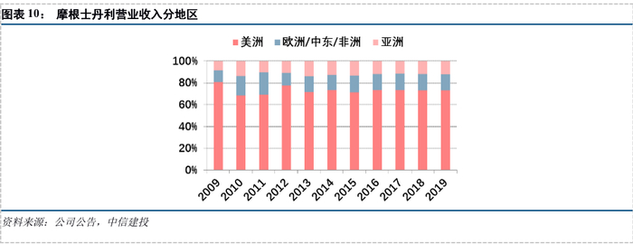 摩根士丹利采取追随“经济增长中心”的扩张模式,形成国际化营业网络。截至2019年末,摩根士丹利以美国纽约为总部,以英国伦敦、日本东京和中国香港等国际金融中心为支点,覆盖全球近40个国家的600多家办公室和60431名员工。2019年度,摩根士丹利从美洲、欧洲中东非洲、亚洲获取的营业收入分别达到302.26亿美元、60.61亿美元和51.32亿美元,分别占营业总收入的73%、15%和12%。