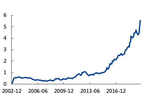 图表9:日本央行持有股票占东京证券交易商总市值比例(%)