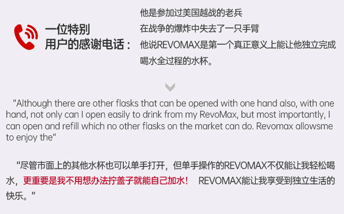 曾经还有一位越战老兵特意致电感谢了制造商,表示他在战时失去了一只手臂,RevoMax运动保温杯可以让他不用想办法拧开盖子就能自己加水,更让他享受到了独立生活的快乐。