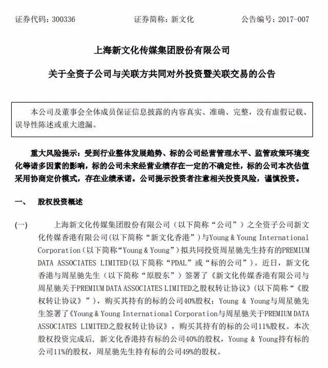 2017年1月,新文化发布公告称,旗下全资子公司新文化传媒香港有限公司(以下简称“新文化香港”)和Young & Young International Corporation(以下简称“Young & Young”)拟共同投资周星驰先生持有的PREMIUM DATA ASSOCIATES LIMITED(以下简称PDAL)。