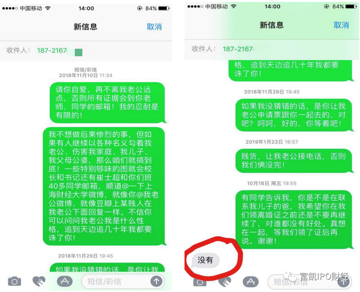 我曾经为了让她远离我的家庭打电话给她,她从来不接,发短信给她,她只回过两个字“没有”,为的就是怕留下证据。但她借我前夫给她庆祝 10 月 15 日生日之机在我前夫面前控诉我欺负她,说我找她妈妈告状了,当天夜里我前夫回到家恨不得把我撕碎了,转头又给傅某某送上奢侈品去安抚。我几个月不怎么吃饭,终于病倒发高烧,家里没药,浑身一点力气没有,电话我前夫回来帮我一 把,傅某某用各种办法缠着他,很晚才回来。后来无意中看到前夫跟她的对话,傅某某说:“姐姐一定很难过,也很难走出来了吧?”我前夫说:“是的,昨天看到你哭红的双眼,我真的心疼,我一定要尽快解决掉这个事。”我才知道为什么我病的这么严重,而我前夫竟 然都不肯回来,是因为傅某某哭红了双眼,真是极度讽刺!不得不说我见识到了一个 21 岁女生远超 40 岁中年人的心机。