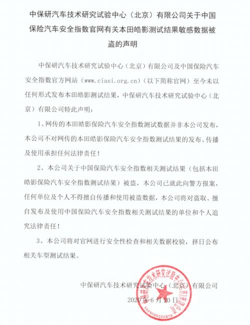 在《中保研汽车技术研究试验中心(北京)有限公司关于中国保险汽车安全指数官网有关本田皓影测试结果敏感数据被盗的声明》中,主要讲了三件事情:
