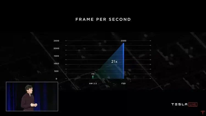 特斯拉展示的 FSD 芯片与英伟达的芯片对比,单位是每秒处理的帧数