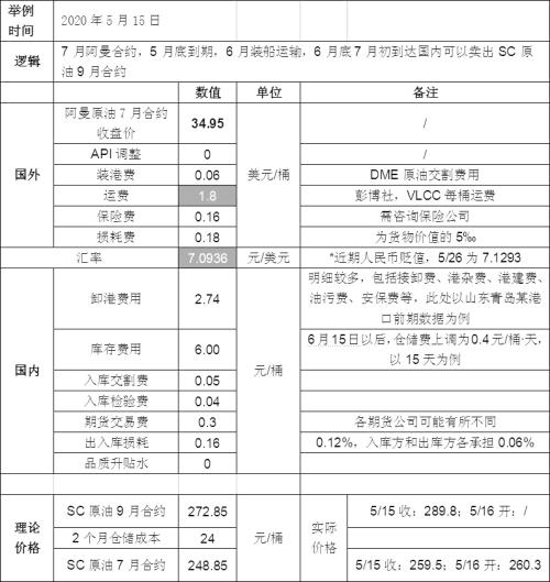 国内部分的库存费用。表格中以15天为例,但航运时间和库存时间仍需根据实际情况确定。当卖方商品入库存放时间增加为30天时,SC原油理论价格也将有所上升。