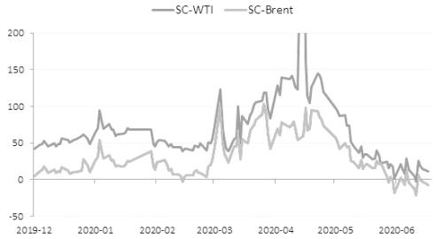 图为SC和WTI、布伦特价差(单位:元/桶)