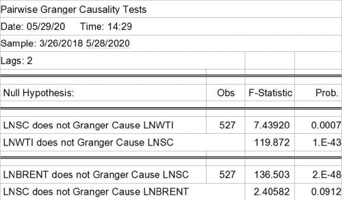 那么是否可以用一种原油期货的涨跌预测其他原油期货的涨跌呢?格兰杰因果关系检验(Granger Causality test)可以检验变量在统计上的时间先后顺序,即三大原油期货价格的变动是否存在先后关系。为此,我们先选取了从SC原油上市后的三种原油结算价,剔除空值后使用ADF检验,发现三组数据的一阶差分(即价格涨跌)数据均为平稳序列,然后再进行格兰杰因果关系检验,结果表明: