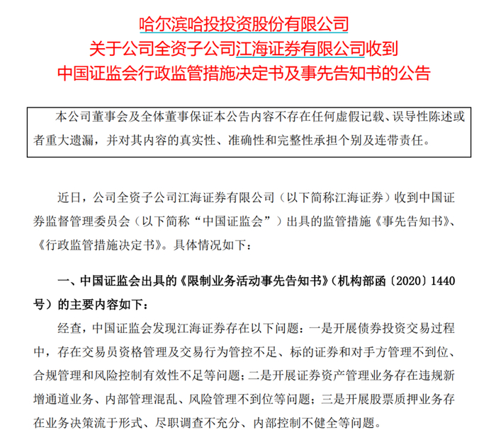 6月22日晚间,上市公司哈投股份公告称,全资子公司江海证券收到证监会出具的一系列行政监管措施决定书及监管措施《事先告知书》。由于债券自营、资产管理、股票质押三大业务领域均存在问题,证监会拟暂停江海证券上述业务6个月,并对分管领导给出认定为不适当人选并限制有关权利等监督管理措施。