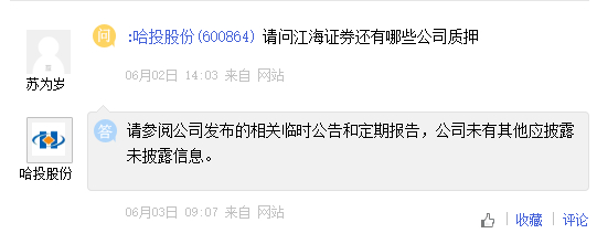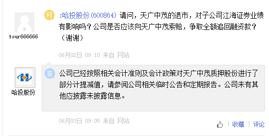 而在近期,江海证券的股票质押业务因“踩雷”天广中茂等退市股,也颇令市场担心。例如,有哈投股份的股民在上证e互动上提问,询问天广中茂对江海证券业绩的影响,并关注江海证券其他股票质押情况。