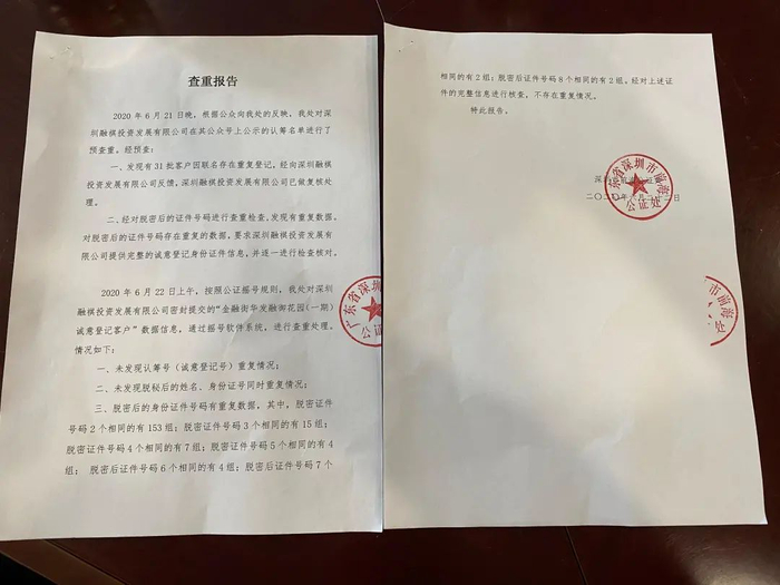 报告显示,6月21日晚,前海公证处对认筹名单进行预查重,发现有31批客户因联名存在重复登记,已做复核处理;经对脱密后的证件号码进行查重检查,发现有重复数据,要求开发商提供完整的诚意登记身份证件信息,并逐一进行检查核对。