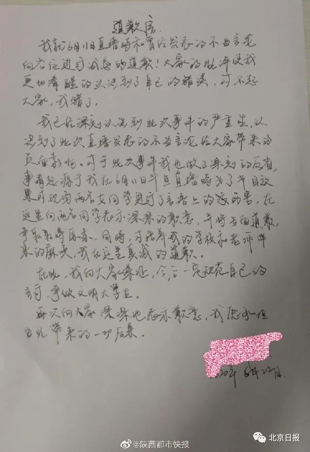 大一男生直播侮辱骚扰女生,手写道歉信后,校方通报